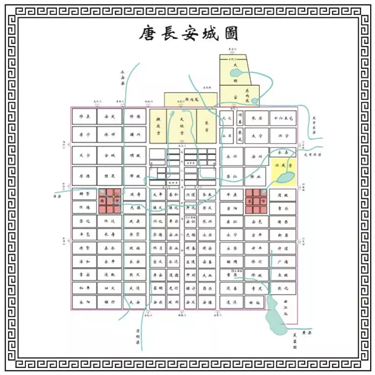宫城位于长安城北部中央,是皇上办公和生活的地方;皇城在宫城的下方,里面分布着大唐的政务机关;除去皇城和宫城以外的区域就是外郭城,是一般群众与官僚的住宅区和商业区,城内纵横分布25条街道,划分出108座里坊和东、西两市。